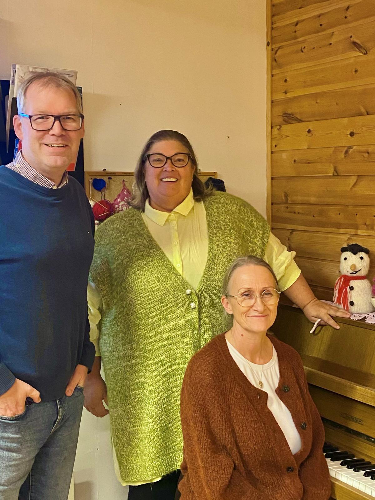 Frank Robert Vik, leder Hustadvika Frivilligsentral, Anita Nygård Hector, leder 2Rett1Vrang og sittende ved piano Toril Elin Krakeli Holm, Diakon i Kirka i Hustadvika.